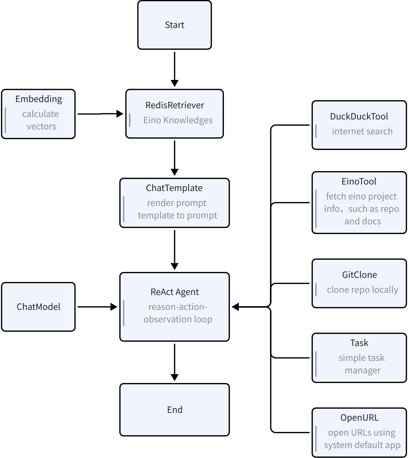 • Tools: DuckDuckGo, EinoTool, GitClone, TaskManager, OpenURL