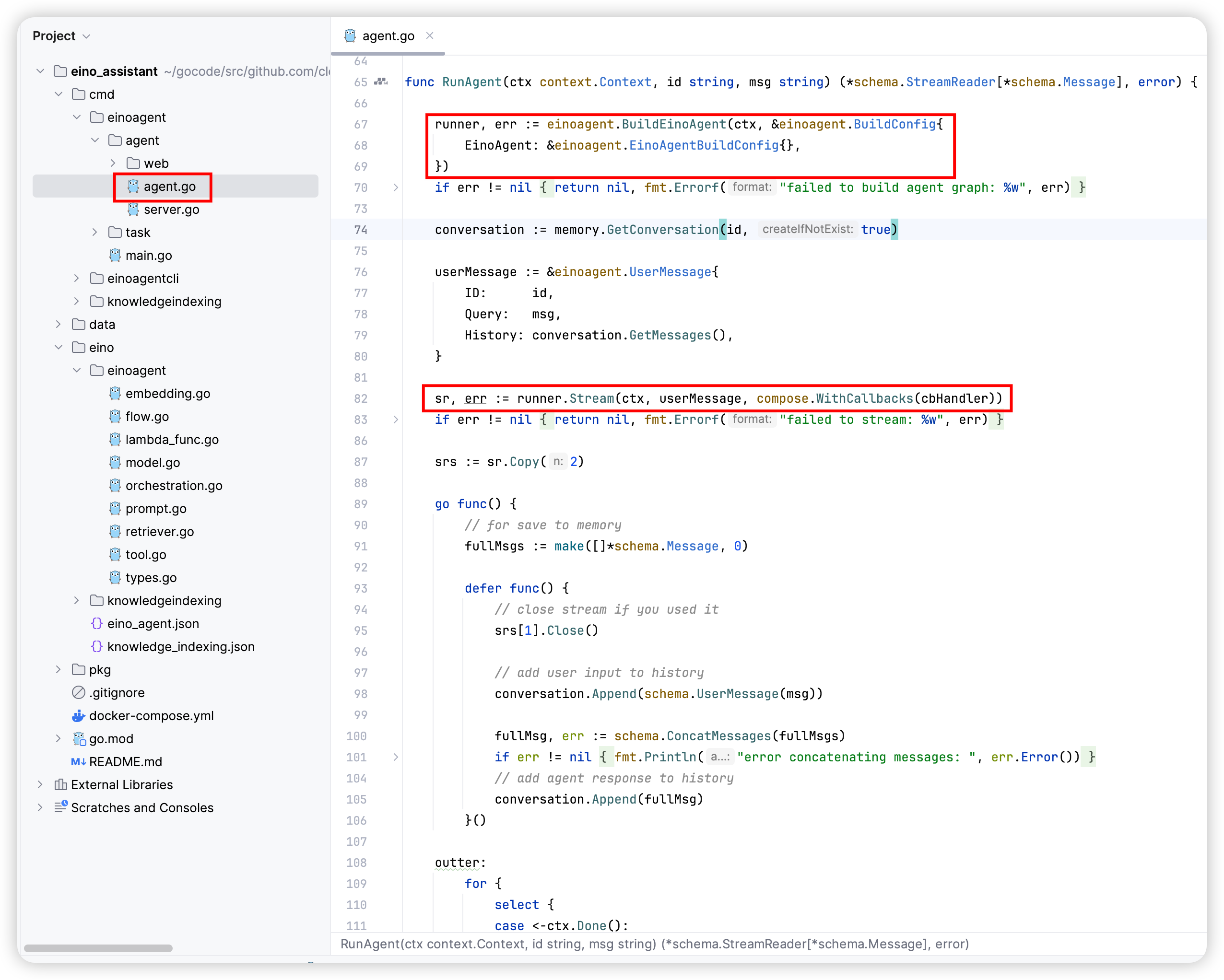 • Eino Agent: decide actions, call tools, iterate until the goal is met