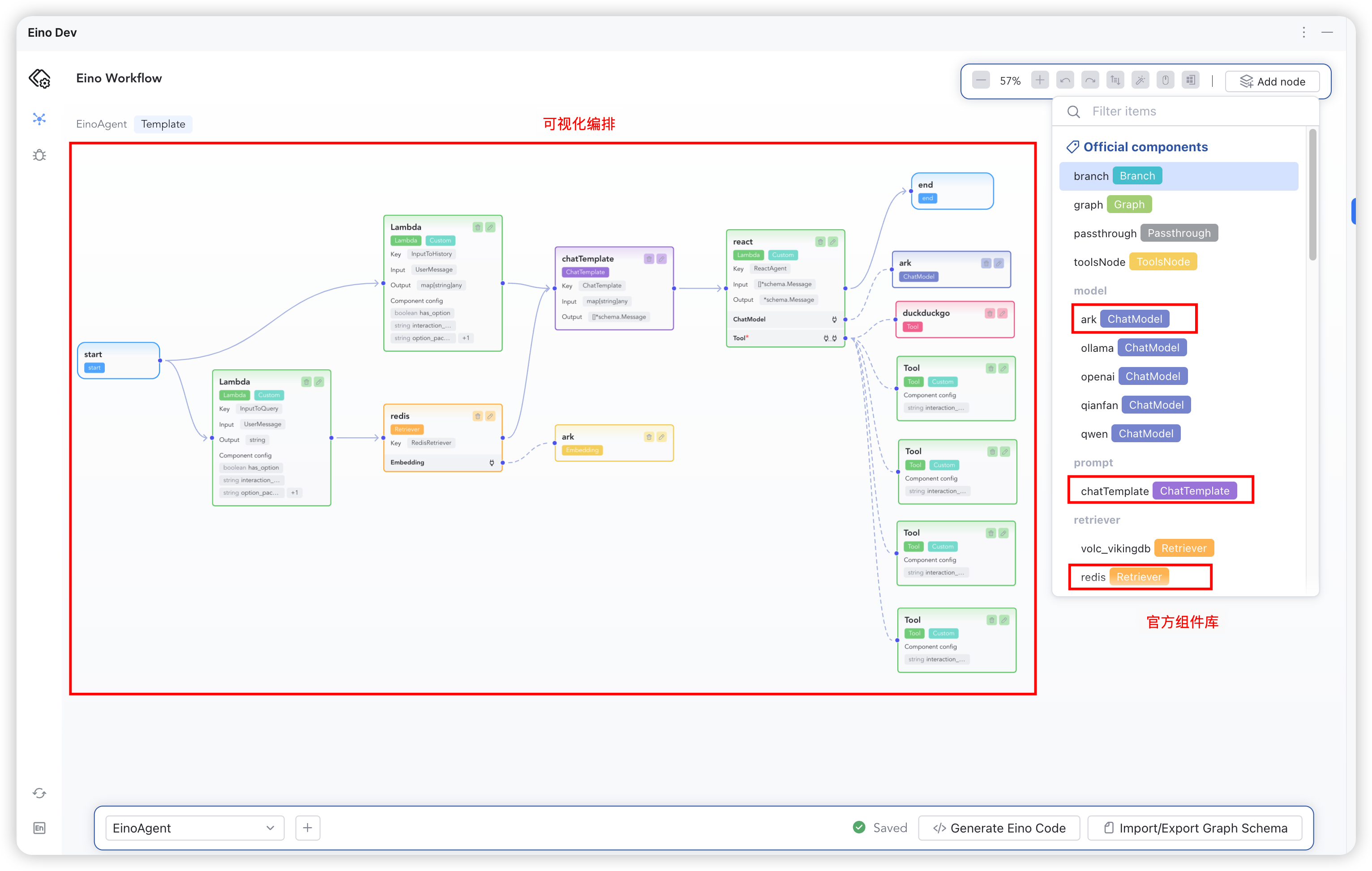 Visual orchestration lowers the learning curve and speeds up development. Experienced users can skip and build directly with Eino APIs.