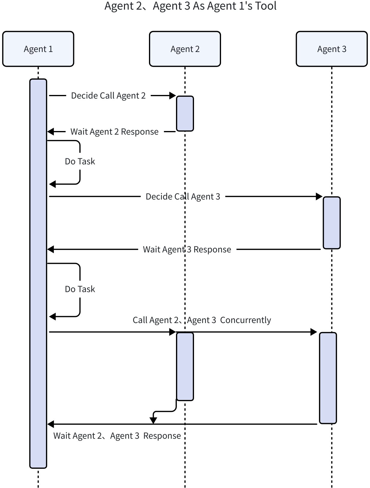 • ToolCall: call an agent as a tool when only parameters are needed; results return to the chat model. Also supports non-agent tools.