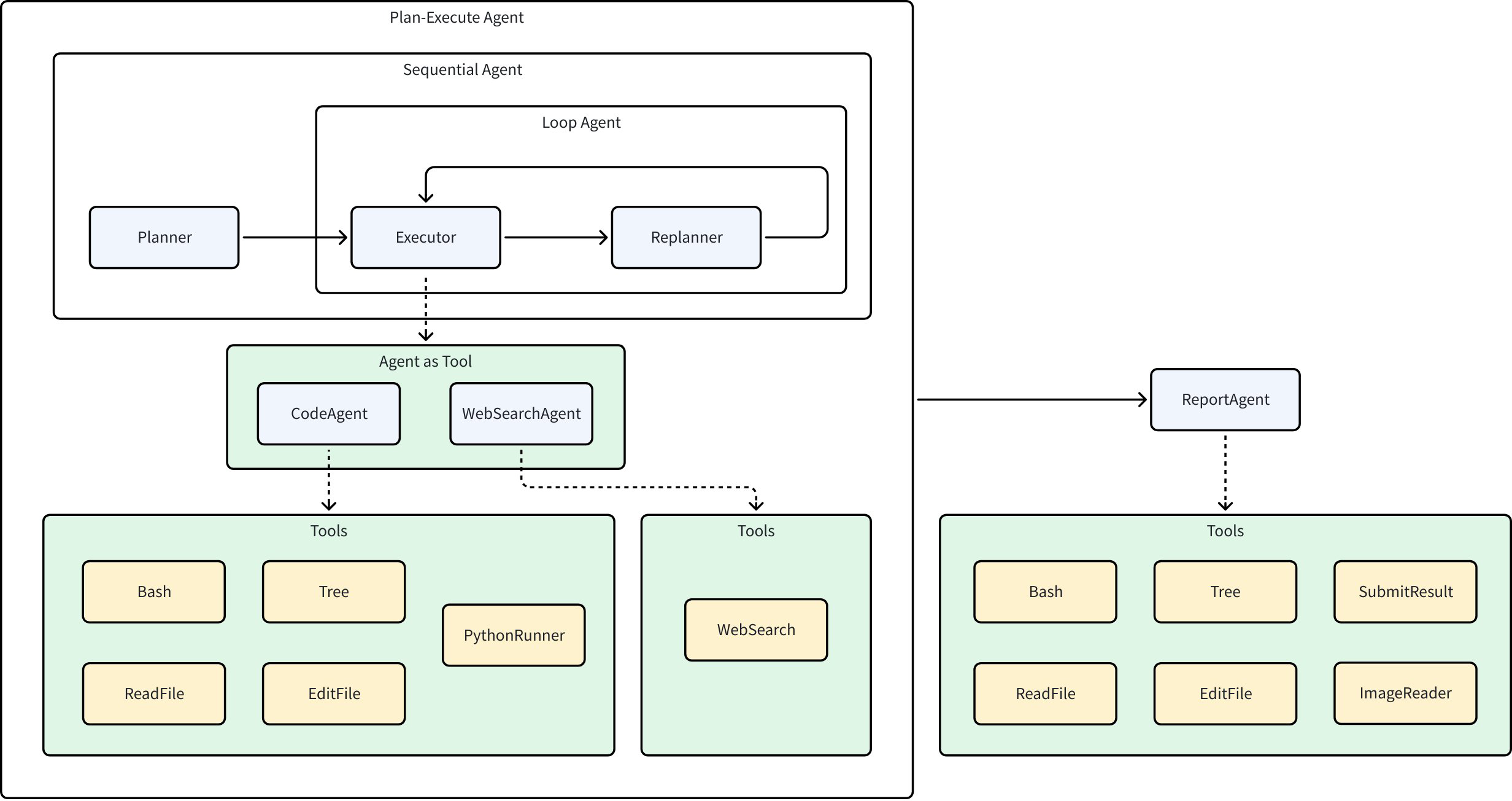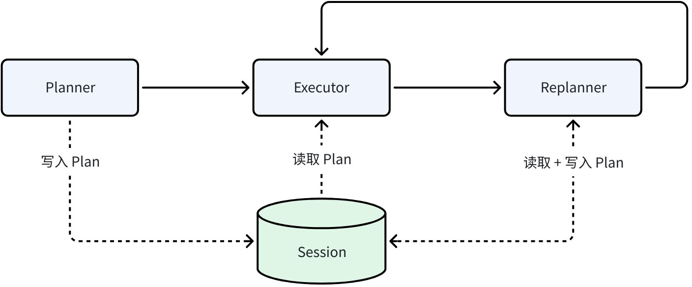 • Shared Session: a KV store alive during the run; agents can read/write SessionValues anytime. Typical Plan-Execute flow: planner writes the initial plan; executor reads and runs; replanner updates the plan back into session.