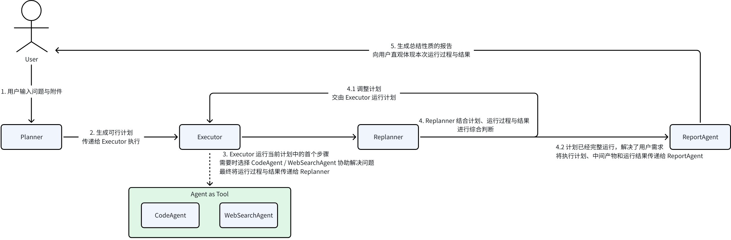 Planner creates plans; Executor executes steps via tools; Replanner evaluates progress and replans.