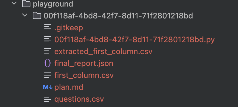 arguments: { "is_success": true, "result": "Successfully extracted the first column from questions.csv and saved it to first_column.csv.", "files": [ { "path": "/User/user/go/src/github.com/cloudwego/eino-examples/adk/multiagent/integration-excel-agent/playground/00f118af-4bd8-42f7-8d11-71f2801218bd/first_column.csv", "desc": "A CSV file containing only the first column data from the original questions.csv." } ] }